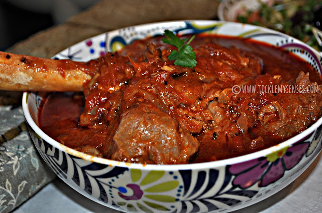 The upper sirloin portion of the leg tends to be naturally tender hence can be slow roasted in a gravy in an oven to give you the same result. If using a whole leg follow steps 1, 2 ,3 then place the onion tomato spice mixture in a roasting tin, add enough water, stir, place the leg of lamb into the spice mixture. Cover with foil and cook in a preheated 325F oven until tender, about 3-5 hours for a whole leg or 2-3 hours for half a leg. Or check in between using a fork. The meat should fall off the bone.
