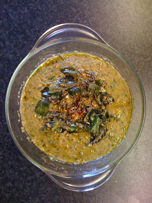 4.For tempering: In hot oil add broken red chillies, curry leaves and urad dal. Pour over chutney.