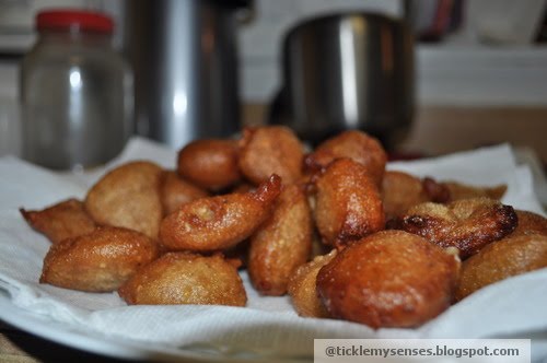 4. Ladle out the fried fritters using a sieved metal spoon onto absorbent tissue paper.