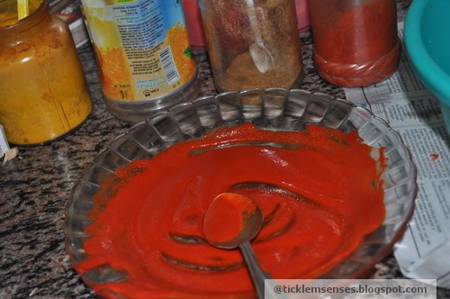 1. Take all masala ingredients in a bowl, add water to make a shiny paste. Do not make runny or too thick.