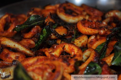 The piquant and heavenly aroma of frying squid with the meet mirsang/ chilli paste is enough to make me drool. The distinct aroma of the curry leaves used in this recipe is irreplaceable. The trick with calamari is to flash fry it, that is cook it on a high heat for a very short time. This brings out its lovely texture. Overcooking it makes it rubbery.