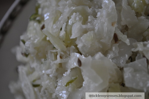 I simply finely sliced up the cabbage and onions and put them in a vessel, chopped up some green chillies and ginger finely, put them into a mortar with some cumin seeds and coarse sea salt… and started banging away ( trust me …very therepeutic 😉 a minute later added a handful of coconut to the coarse mix and continued banging for a minute more…and then I was done.