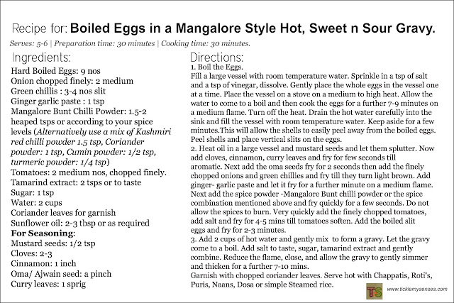 This Egg preparation is really delicious, it is well rounded with the right balance of heat, spice, sweet and sourness. I know of many people who do not like anything sweet in savoury dishes, including hubby, but this one he thoroughly enjoyed. I tend to make this preparation using the Mangalore Bunt chilli powder ( available in most Mangalore Stores or can be easily prepared at home), alternatively use the basic spice combination given in the recipe below, to give you an equally delicious curry. This gravy is semi thick in consistency and will make a lovely accompaniment to Chappatis, Parotas, Rotis, Naans, Puris, Dosas or even rice.