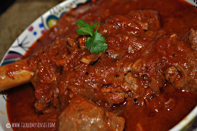 The upper sirloin portion of the leg tends to be naturally tender hence can be slow roasted in a gravy in an oven to give you the same result. If using a whole leg follow steps 1, 2 ,3 then place the onion tomato spice mixture in a roasting tin, add enough water, stir, place the leg of lamb into the spice mixture. Cover with foil and cook in a preheated 325F oven until tender, about 3-5 hours for a whole leg or 2-3 hours for half a leg. Or check in between using a fork. The meat should fall off the bone.