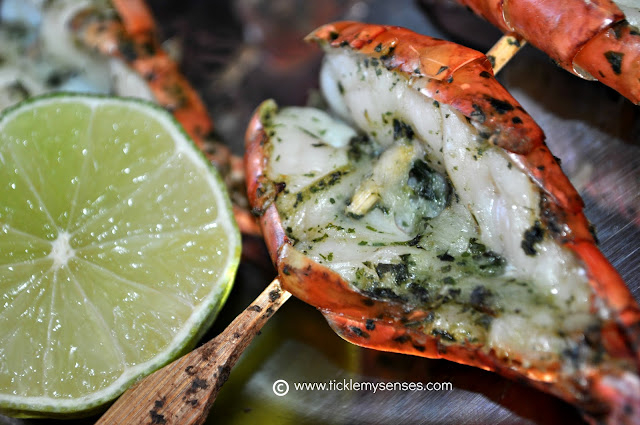 4. After an hour thread 5 prawns on to each skewer. Place the skewers on the hot bbq for a 2-3 minutes on each side. Serve hot. If grilling in an oven place the prawns on the top shelf of an oven at 250C and allow the prawns to grill for 3- 5 minutes till the shells start to turn pink and the flesh white.