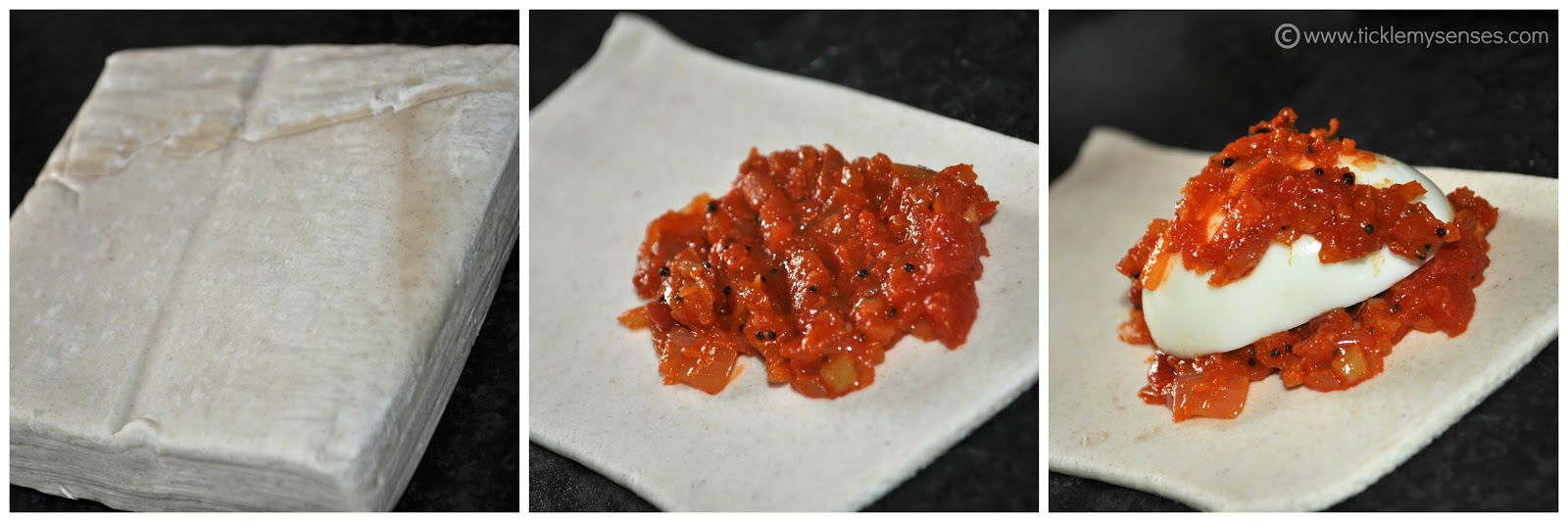 4. Divide a ready rolled sheet of puff pastry to eight equal portions. Divide the cooled onion tomato spice mixture equally between them. Cut each boiled egg into 2 equal halves along its length. Invert one half of a boiled egg over the mixture, brush the sides of the pastry with water, close the pastry till edges meet and seal well. Place slits or a cross on top of the puff.