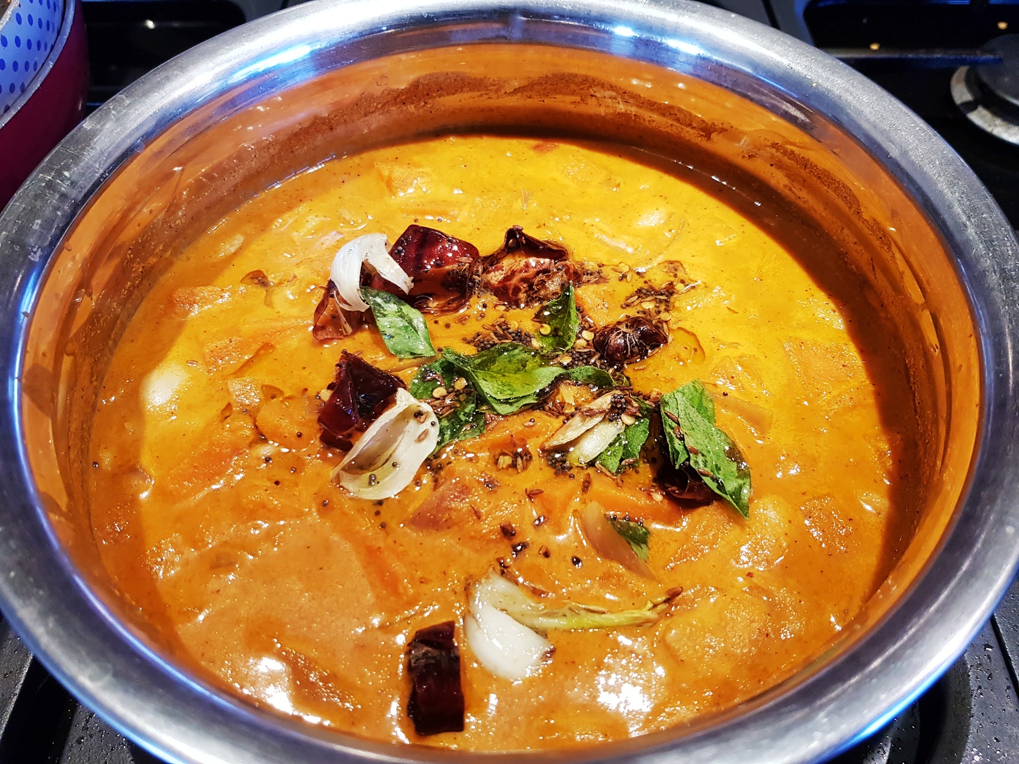 To make the curry, the pumpkin or squash is deskinned, cubed and cooked in salted water until tender. A mixture of roasted spices like dried chillies, whole coriander, cumin and mustard is ground with coconut and added to the cooked vegetable. Finally, season with whole spices. Serve with white rice or flat breads.