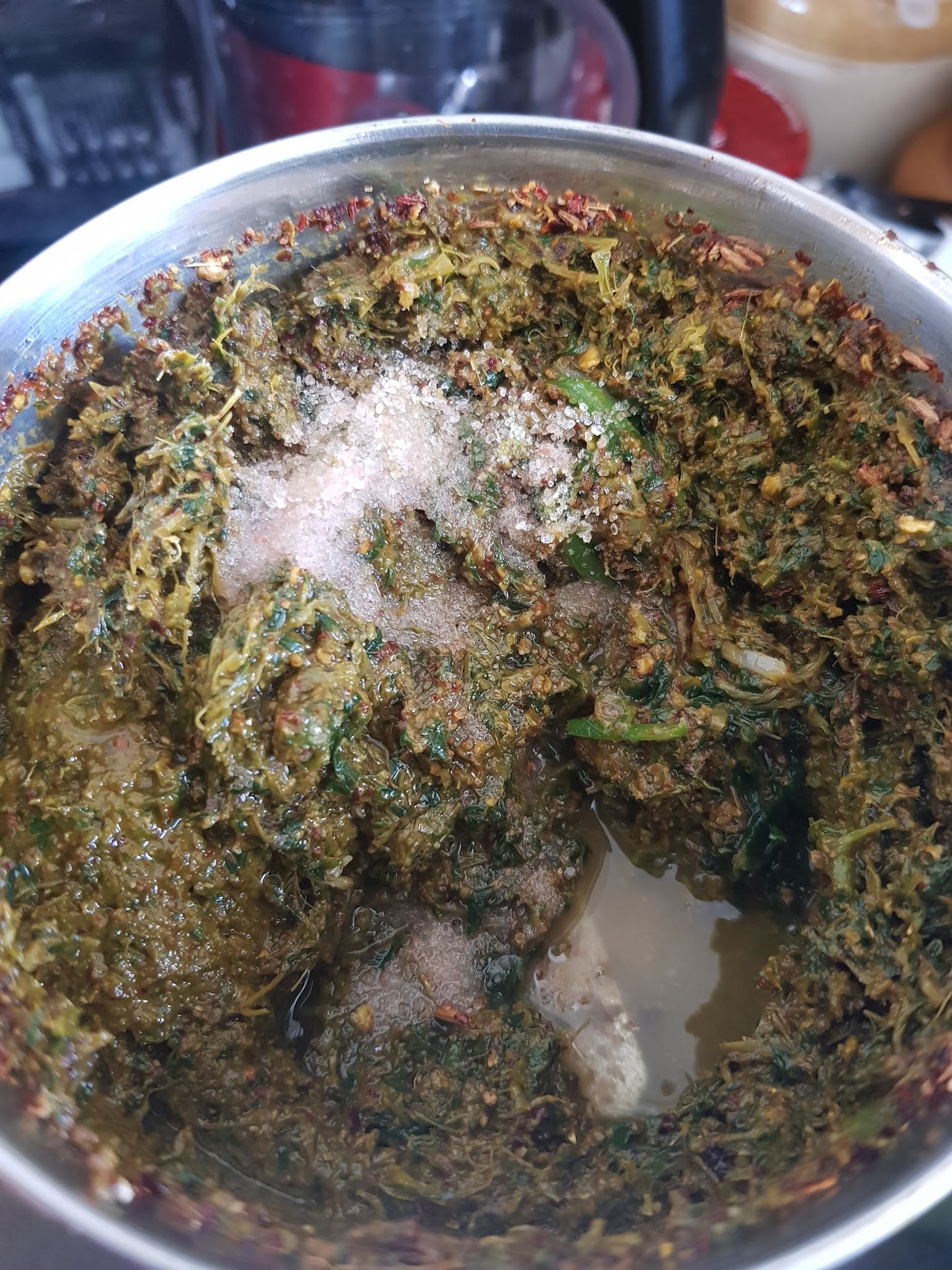 9. Add salt and vinegar to the ground mix and blitz for 10 seconds. Taste and adjust. The pickle should be slightly salty and sour to taste (the sourness or high acidity in the pickle helps in preservation by creating an unfavourable enviroment for the growth of bacteria or its spores). Keep the ground paste aside. Next prepare for seasoning the paste.