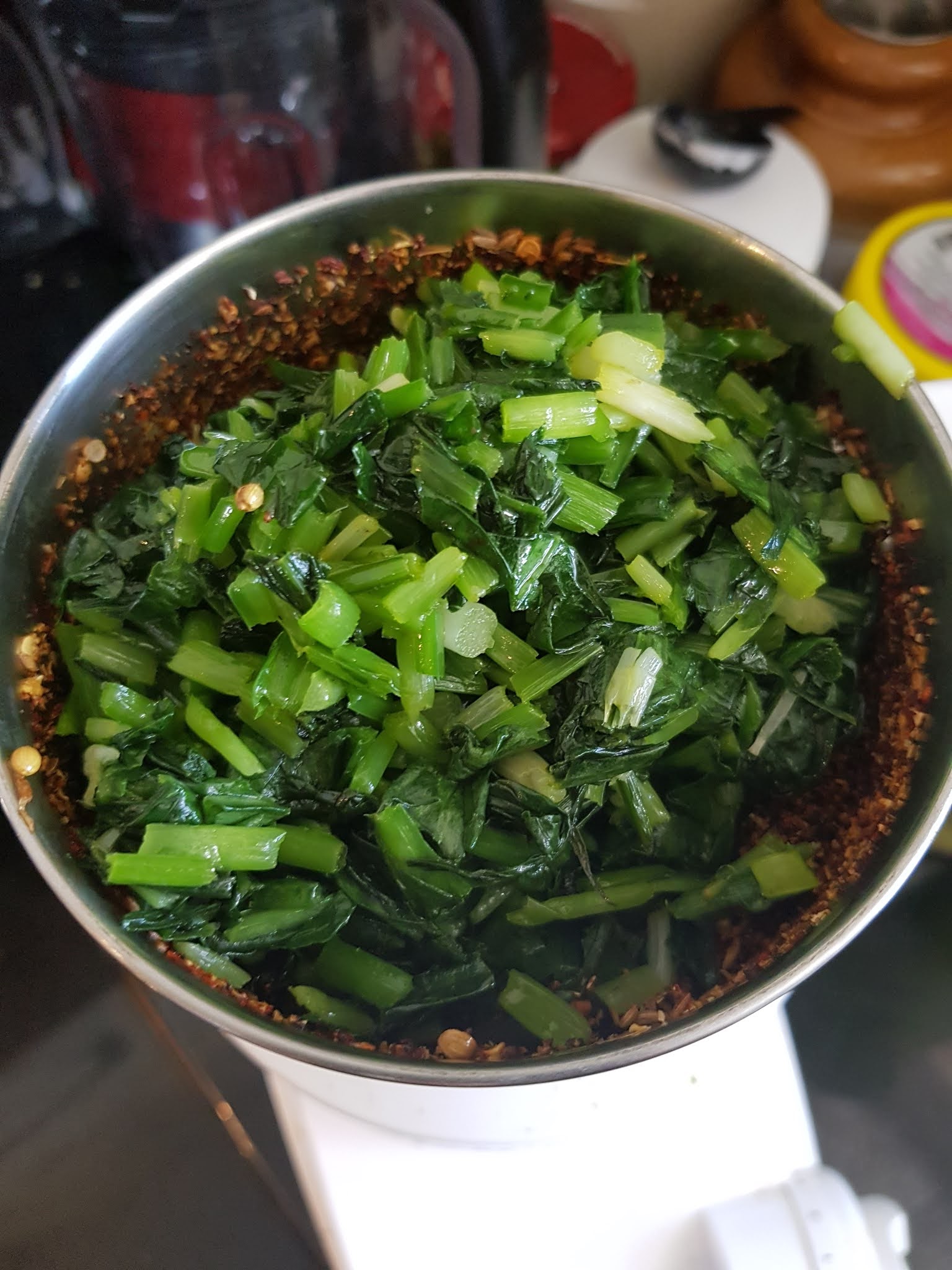 5. In the same pan, add the chopped wild garlic leaves and saute for 5-7 minutes on a medium flame until the leaves are softened and wilted. Keep aside to cool.