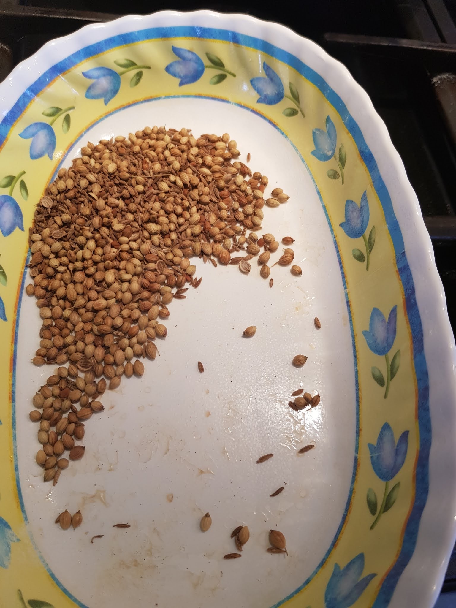 3. Place a pan over a medium flame. Place the whole coriander seeds,cumin seeds and fenugreek seeds in the pan and dry roast till fragrant (approx 1-2 mins). Keep aside to cool down.