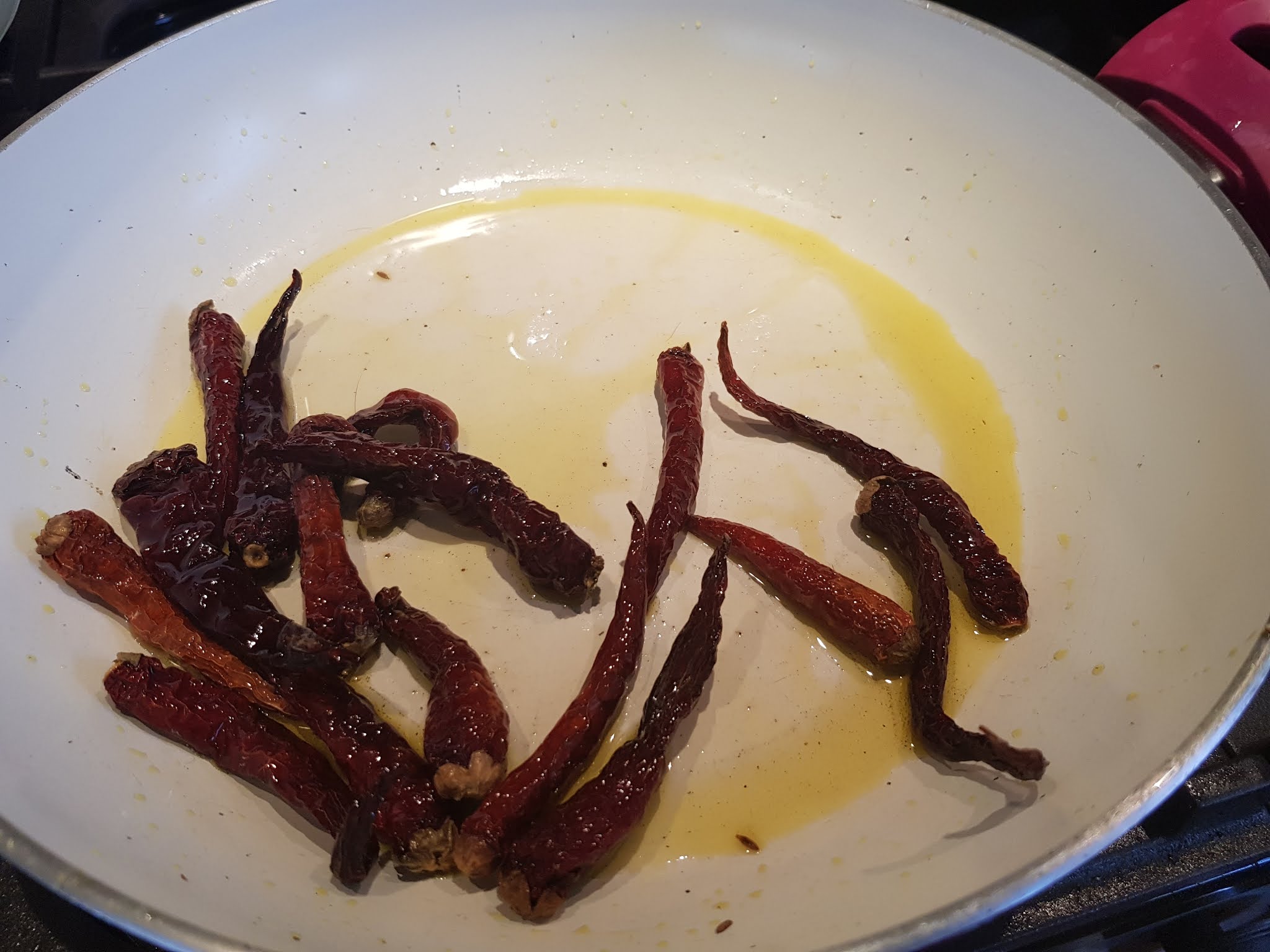 4. In the same pan take 1/4 cup oil and when hot add the dried red Kashmiri chillies. (I have used the Kashmiri red chillies which are mildly hot. If substituting with other chillies please reduce the quantity to 4-5nos or according to the type of chilli used, as some chillies can be very hot!). Once the chillies are gently toasted and fragrant, take out the chillies from the oil and keep aside to cool.